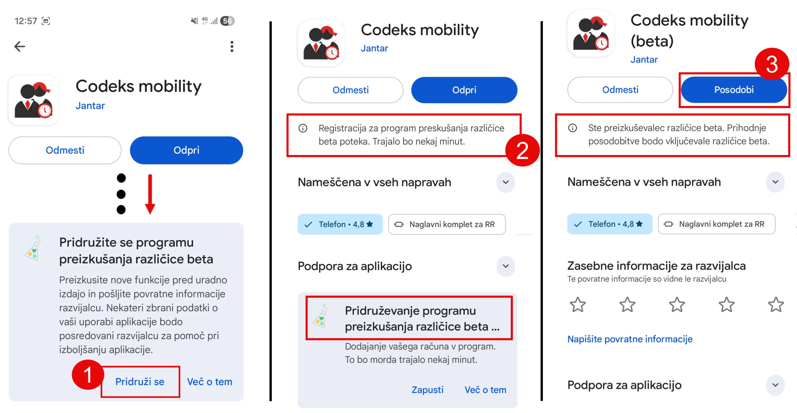 Če uporabljate Android napravo, se lahko beta testiranju pridružite prek Google Play.